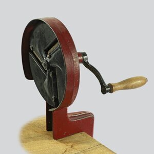 Kleine weiße Wringmaschine zur Befestigung an einer Waschmaschine. Sie besitzt 2 Rollen. Die maximal 30 cm breiten (oder zusammengefalteten) Wäschestücke wurden zwischen 2 Walzen, die über eine Handkurbel angetrieben wurden, durchgepresst und verloren dadurch etwa die Hälfte des in diesen nach dem Waschvorgang vorhandenen Wassers, was die Trockenzeit erheblich reduzierte. Der Antrieb erfolgt direkt durch eine Kurbel. Keine Federn oder sonstiges Zubehör vorhanden. Füße und Außenhülle bestehen aus emailliertem Blech. Die Kurbel ist einklappbar.
