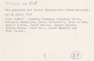 Auf dem Foto ist die Fußballmannschaft von 1930 zu sehen. Sie gehörten der ersten Bodendorfer Fußballmannschaft an, die im Jahre 1919 in der Gaststätte Cholin gegründet wurde. (von links) Hermann Hermann, Johannes Wirtz, Heinrich Manhillen, Fritz Gottschalk, Toni Welsch, Arnold Alfter, Josef Nelles, Lorenz Welsch, untere Reihe: Peter Koll, Josef Büschel und Toni Welsch. Fritz Gottschalk musste wegen seines jüdischen Glaubens 1942 vor den Nazis nach Amerika fliehen. Seine Eltern wurden zuerst nach Treblinka und dann nach Thereseinstadt deportiert und dort umgebracht.