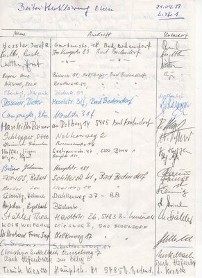 Die Erstschrift des Protokolls, mit Schreibmaschine geschrieben, und die der Anwesenheitsliste der Gründungsmitglieder des Heimat- und Bürgerverein Bad Bodendorf e.V. vom 21.04.1988 in der Gaststätte Winzerverein in Bad Bodendorf. Nach Auflösung des Verkehrsvereins wurde der Heimat- und Bürgerverein gegründet, der teilweise die Aufgaben des Verkehrsvereins übernahm.