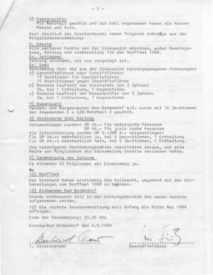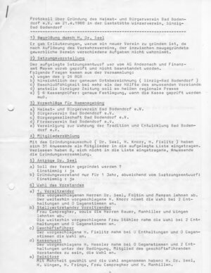 Die Erstschrift des Protokolls, mit Schreibmaschine geschrieben, und die der Anwesenheitsliste der Gründungsmitglieder des Heimat- und Bürgerverein Bad Bodendorf e.V. vom 21.04.1988 in der Gaststätte Winzerverein in Bad Bodendorf. Nach Auflösung des Verkehrsvereins wurde der Heimat- und Bürgerverein gegründet, der teilweise die Aufgaben des Verkehrsvereins übernahm.