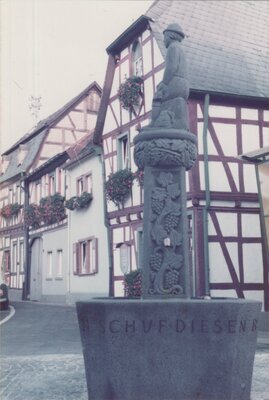 Die Aufnahme ist oberhalb Bodendorf aufgenommen an den Hängen des Reisberges unterhalb des Weges zum Peterstal. Eine Frau posiert für das Foto im Weinberg. Die Rebstöcke sind nicht an einem Spalier, sondern einzeln an Stöcken gezogen.