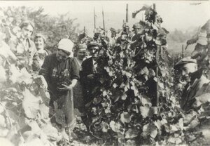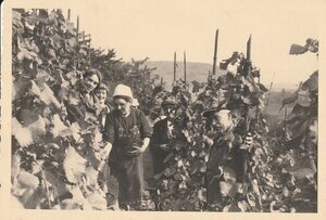 Die Aufnahme ist oberhalb Bodendorf an den Hängen des Reisberges im Weinberg Cholin aufgenommen und zeigt Winzer und Helfer bei der Weinlese. Die Frau in der ersten Reihe links im Bild ist Anna (Änni) Katharina Rausch aus Hausen/Eifel am Ernten und trägt rote Reben in der Armbeuge.