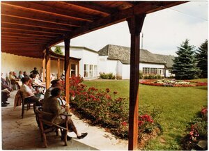 Druckvorlage für Ansichtskarte, Motiv: "Gäste sitzen im Wandelgang und blicken in Kurgartenteil hinter Kohlensäureverflüssigungsanlage"