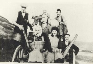 Gruppenfoto der Familie Beitzel 1937 vor der Weinlese am Transportwagen