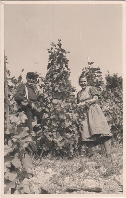 Das Foto zeigt die Familie Beitzel mit Elisabeth Beitzel im Jahr 1937 vor der Weinlese am Reisberg. Auf dem Transportfass ist mit Kreide das Jahr der Weinlese aufgemalt.