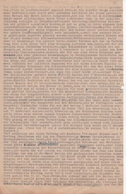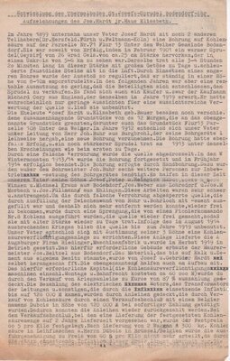 In dem 3-seitigen eng mit Schreibmaschiene beschriebenen Dokument beschreibt Josef Hardt jr. die Entwicklung von der ersten Quellenbohrung 1899 bis ins Jahr 1933. Auf Seite 3 sind handschriftliche Ergänzungen in Stichwortform als Zwischeninformationen bis 1924 und Ergänzungen von 1935 bis 1972 notiert. Das Dokument ist rückseitig bedruckt. Eine Seite der Dienststelle "Bürgerlicher Aufklärungsdienst in Wiesbaden (26.08.1953), Einladung des Kammerchor Bad Neuenahr (Juni) und einem Bestellschein für Schulbücher. Die letzten Seiten ist ein Reinschrift.