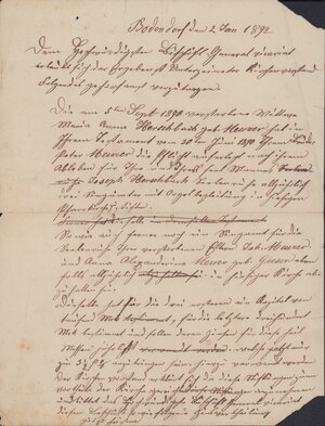 Im Schreiben teilt Heinz Giesen der Bezirksregierung mit welchen Einfluss die Vertretung auf die kirchl. Belange hat. Das Dokument besteht aus 2 Seiten. Auf der Rückseite datiert 2. Jan. 1892 ist eine nicht unterschriebene Notiz über eine Aussage des bisch. General-Vikariats.