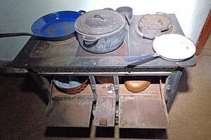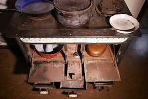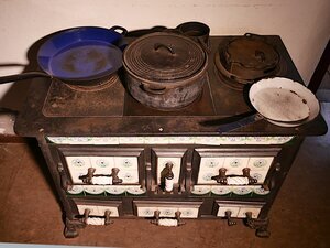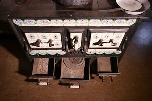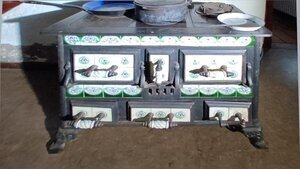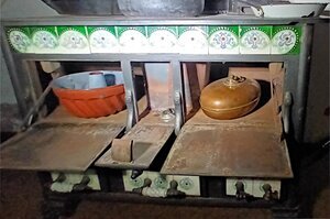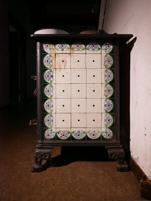 Großer auf der Vorderseite und den beiden Seiten mit Keramikfliesen verzierter Küchenherd. Der Herd stammt aus der Region Wallonie/Nordfrankreich und wurde von einem Antiqitätenhändler erworben. Er besitzt 3 Kochstellen und 2 Bratröhren sowie eine Vorrichtung zur Regulierung des Luftzugs an der Frontseite. Der Ofen wurde von der Mitte aus beheizt. Die grün-weissen Fliesen sind mit einem Jugendstil-Muster geschmückt.