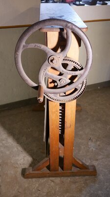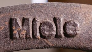 Große Wäschemangel (Standgerät) mit 3 Walzen sowie einem Getriebe mit Handkurbel der Marke Imperator aus dem Hause Miele. Es handelt sich um ein Modell im Holzgestell mit Unterfederung. Das Gestell und die Walzen sind aus Holz, die Mechanik und das Kurbelrad sind aus Gusseisen. Die Mangel besitzt drei hölzerne Rollen. Auf dem oberen Brett befindet sich ein leicht beschädigter Aufkleber mit blauem Hintergrund und der weissen Schrift "Imperator". auf dem mit der Kurbel verbundenen Schwungrad befindet sich die Markenbezeichung "Miele" und darunter die Typbezeichung "Ma 75320 H". Die Mangel besitzt polierte Walzen aus allerbestem, sorgfältig gepflegtem Buchenhartholz mit durchgehenden viereckigen Achsen. Weiterhin kräftige elastische Federung, stabile Anlegebretter und ein starkes Getriebe. Das System der drei Walzen unterscheidet sich von dem mit zwei Walzen dadurch, dass bei den Zweiwalzenmangeln die Wäsche zwischen den beiden Walzen einige Mal hin- und hergerollt wird, wo hingegen sie bei den Dreiwalzenmangeln mit dem Rolltuch um die mittlere Walze gewickelt wird. Die 75 cm breiten Rollen werden durch eine Kurbel und über Zahnräder angetrieben. An der Vorderseite befindet sich auf Rollenhöhe ein bei Nichtbenutzung herunterklappbares Anlegebrett, das dazu diente, die Wäsche möglichst glatt in die Rollen einführen zu können. Unten - parallel zu den beiden Beinen der Mangel - befinden sich zwei Schraubfedern, die Druck auf die Walzen ausüben. Technische Daten: Walzenlänge: 75 cem, Walzenstärke: 12 cm, Tiefe der Tischplatte: 65 cm, Gesamthöhe: 110,5 cm, Höhe bis zum Anlegebrett: 75.5 cm, Gewicht etwa 70 kg; Verkaufspreis : 72,00 RM Wir bedanken uns beim MIELE-Museum für die ausführlichen Information zu dieser Wäschemangel.