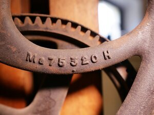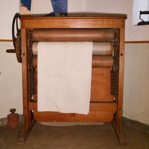 Große Wäschemangel (Standgerät) mit 3 Walzen sowie einem Getriebe mit Handkurbel der Marke Imperator aus dem Hause Miele. Es handelt sich um ein Modell im Holzgestell mit Unterfederung. Das Gestell und die Walzen sind aus Holz, die Mechanik und das Kurbelrad sind aus Gusseisen. Die Mangel besitzt drei hölzerne Rollen. Auf dem oberen Brett befindet sich ein leicht beschädigter Aufkleber mit blauem Hintergrund und der weissen Schrift "Imperator". auf dem mit der Kurbel verbundenen Schwungrad befindet sich die Markenbezeichung "Miele" und darunter die Typbezeichung "Ma 75320 H". Die Mangel besitzt polierte Walzen aus allerbestem, sorgfältig gepflegtem Buchenhartholz mit durchgehenden viereckigen Achsen. Weiterhin kräftige elastische Federung, stabile Anlegebretter und ein starkes Getriebe. Das System der drei Walzen unterscheidet sich von dem mit zwei Walzen dadurch, dass bei den Zweiwalzenmangeln die Wäsche zwischen den beiden Walzen einige Mal hin- und hergerollt wird, wo hingegen sie bei den Dreiwalzenmangeln mit dem Rolltuch um die mittlere Walze gewickelt wird. Die 75 cm breiten Rollen werden durch eine Kurbel und über Zahnräder angetrieben. An der Vorderseite befindet sich auf Rollenhöhe ein bei Nichtbenutzung herunterklappbares Anlegebrett, das dazu diente, die Wäsche möglichst glatt in die Rollen einführen zu können. Unten - parallel zu den beiden Beinen der Mangel - befinden sich zwei Schraubfedern, die Druck auf die Walzen ausüben. Technische Daten: Walzenlänge: 75 cem, Walzenstärke: 12 cm, Tiefe der Tischplatte: 65 cm, Gesamthöhe: 110,5 cm, Höhe bis zum Anlegebrett: 75.5 cm, Gewicht etwa 70 kg; Verkaufspreis : 72,00 RM Wir bedanken uns beim MIELE-Museum für die ausführlichen Information zu dieser Wäschemangel.