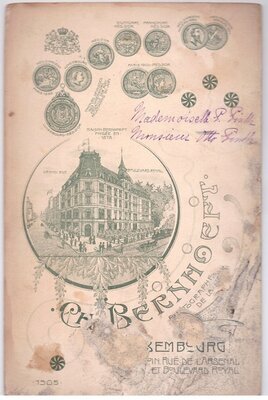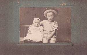 Zu sehen sind zwei Kinder, ein älteres und ein deutlich jüngeres. Beide haben auf einer kleinen Bank Platz genommen. Das kleinere Mädchen trägt ein weißes Kleid und eine kleine, weiße Schleife im Haar. Der größere Junge lehnt sich an die Bank und hat den rechten Arm um das Mädchen gelegt. Er ist etwas zu klein, deshalb hat man ihm ein Kissen untergelegt. Er trägt einen Anzug mit kurzer Hose und breitem Gürtel. Das Foto ist auf ein Stück Pappe geklebt, auf dem unten der Name und der Sitz des Ateliers vermerkt sind.