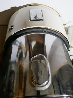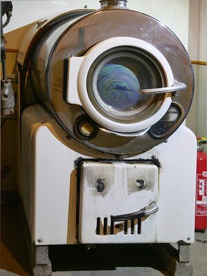Frontlader Miele Waschmaschine mit Feststofffeuerung. Die Waschmaschine besitzt eine große, horizontal aufgehängte Trommel. Sie ist eine Trommelwaschmaschine, ein Frontlader und eine der ersten Waschmaschinen mit einem "Bullauge", d.h. einer gläsernen Tür an der Vorderseite der Maschine. Die horizontal liegende Trommel mit beidseitiger Lagerung wird um 90° gedreht und ist nur noch an der Rückseite gelagert. Die Öffnung nach vorn und die bullaugenähnliche Glastür sind äußeres Kennzeichen der beginnenden Automatisierung des Waschens. Die Maschine wurde alternativ für jede Beheizungsart geliefert: Kohle, Stadtgas, Propangas, Elektrizität und Dampf. Die Konstruktion garantiert kurze Waschzeiten und - wie schon damals hervorgehoben wird - sparsamen Energieverbrauch. Bei der Maschine befindet sich der Trommel die Brennkammer für die Befeuerung mit Kohle. Oben auf der Waschmaschine befinden sich Vorrichtungen zum Einfüllen von Waschmittel. Links an der Waschmaschine befindet sich der Zulauf, rechts der Ablauf. Die Waschtrommel besteht aus massivem Kupfer und ist auf unbegrenzte Zeit völlig rostsicher. Das Fassungsvermögen der Waschtrommel beträgt 7 kg trockene Wäsche. Technische Daten: Höhe: 111 cm, Breite: 82 cm, Tiefe: 90 cm, Gewicht: 177 kg Wir bedanken uns beim MIELE-Museum für die ausführlichen Information zu dieser Waschmaschine.