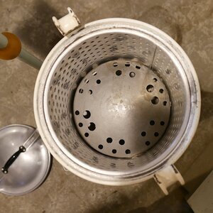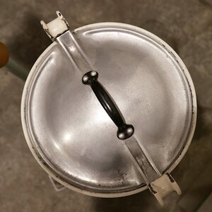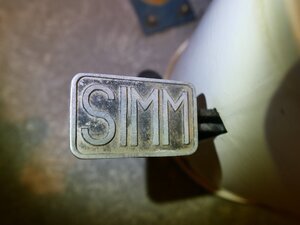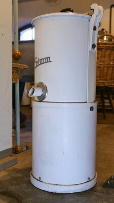 Wäschepresse mit Hydraulischer Fußpumpe. In einen metallenen Zylinder wird ein Gummisack eingehängt und dieser von oben mit der auszupressenden Wäsche gefüllt. Danach wird der Zylinder mit einem Deckel fest verschlossen. Diese Wäschepresse hat die Besonderheit, das der Druck auf die Wäsche nicht mit eingelassenem Wasser, sondern mit einem Fußhebel erzeugt wird. Das Wasser fliest nach unten ab. Der Hersteller "Simm" ist leider nicht zu identifizieren.