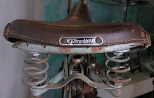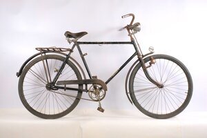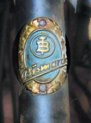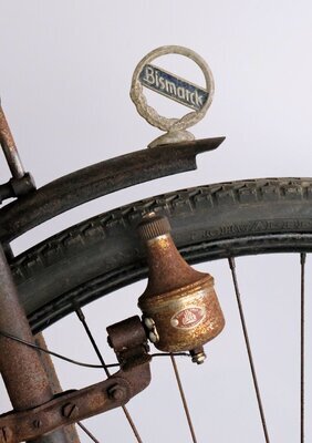 Ein Scheunenfund der zu uns gelangte. Das Herrenrad der Marke „Bismarck“ mit 28 Zoll, ist schwarz lackiert, mit einem feinen blauen Streifen am Rahmen und Schutzblechen. Die Rahmennummer 1.095.566 deutet auf die Herstellung im Jahr 1949/1950 hin. Die eingestanzte Jahreszahl 49 (1949) auf der Torpedo Nabe bestätigt dies. Auf dem Unterrohr sowie auf dem hinteren Schutzblech sind Abziehbilder „Bismarck“ angebracht. Das Steuerrohrschild sowie das Firmenschild, auf dem vorderen Schutzblech, ist aus Metall. Ausgerüstet ist das Rad mit einer Rücktritt- und einer Stempelbremse. Beleuchtung und Gepäckträger waren damals Zubehörartikel und wurden später nachgerüstet. Die Beleuchtung trägt den Namen "Schmitts Original". Das Speichenschloß ist noch vorhanden, aber nicht mehr funktionsfähig (eingerostet). Am Sattel ist ein Metallschild befestigt mit der Aufschrift: Elbracht &Co Kg.