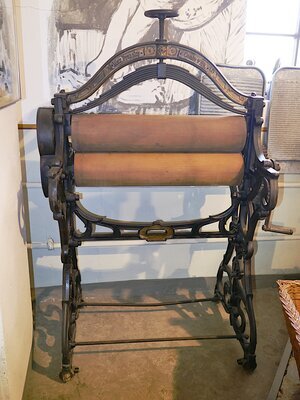 Wäschemangel aus Gusseisen mit zwei Holzwalzen im Jugendstildekor. Die Walzen werden von einer Kurbel über Zahnräder angetrieben. Über den Walzen befindet sich ein Bügel mit einer Stellschraube über die die darunter liegenden Blattfedern nach unten gedrückt werden konnten um den Druck zwischen den beiden Walzen zu regulieren. Die maximal 100 cm breiten (oder zusammengefalteten) Wäschestücke wurden zwischen 2 Walzen, die über eine Handkurbel angetrieben wurden, durchgepresst . Die Inschrift: Max Franzky Coeln a/ Rh. deutet auf den Händler für Möbelbeschläge und Eisenwaren Max Franznky in Cöln (heute Köln), Breitestrasse 42-46. Die Firma steht heute als zum Jahresbeginn 1975 gelöscht im Handelsregister (https://www.kompany.de , https://www.northdata.com ). Die Wringmaschine wurde wohl von einer Gießerei im Auftrag des Händlers gegossen.