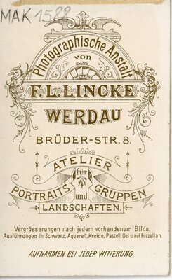 Das Foto entstand in einem Fotostudio als Vignettenaufnahme. Die junge Frau trägt ein dunkles Oberteil mit leicht angedeuteten Puffärmeln. Der Ausschnitt ist sternförmig, mit einem hellen Spitzeneinsatz und mit einem schwarzen Band umsäumt. Das streng nach hinten gekämmte Haar trägt sie als Knoten. Die Aufnahme entstand im Atelier F.L. Lincke in Werdau. Auf der Rückseite befindet sich Eigenwerbung.