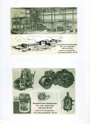 Zweiseitiges Werbeblatt des in Trier ansässigen Industriegrafikers Erich Prinz. Neben Angaben zum Leistungsspektrum und dem Geschäftssitz befindet sich auf der Vorderseite eine Portraitaufnahme des Grafikers. Die Rückseite zeigt, im Postkartenformat, im oberen Teil als perspektivische Zeichnung ein Fabrikgelände mit verschiedenen Gebäuden und darüber das Innere einer Fabrikhalle. Im unteren Teil sind als perspektivische Schnittzeichnungen insgesamt fünf Baumaschinen abgebildet.