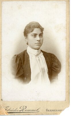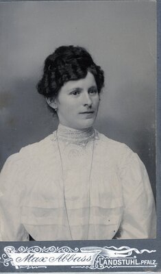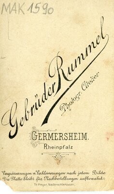 Das Bild ist in einem Fotostudio als Vignettenaufnahme aufgenommen worden. Die junge Frau trägt eine helle Bluse mit Stehkragen, der mit Rüschen besetzt ist. Über der Bluse trägt sie ein dunkles Bolero mit üppigen Puffärmeln, der mit einer Bordüre eingefaßt ist. Um den Hals Trägt sie eine dünne kurze Kette sowie dünne Creolen an den Ohren. Ihre Haare sind leicht gewellt und im Nacken zusammen genommen. Etwas nach links gedreht schaut sie an der Kamera vorbei. Die Aufnahme entstand im Atelier der Gebrüder Rummel in Germersheim. Die Rückseite ist mit Eigenwerbung bedruckt.