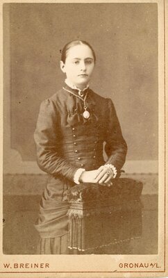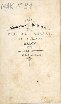 Die Frau steht im Studio vor einer hellen Leinwand an einem Postament. Sie trägt einen bodenlangen dunklen Rock mit einem Volant am unteren Ende. Das verlängerte Oberteil mit Schößchen hat lange Arme und ist reich mit Rüschen und Schleifen verziert. Darunter erkennt man eine helle Bluse mit langen Armen und kleinem Kragen. Ihr rechter Arm, an deren Hand sie einen Ring trägt, liegt auf dem Postament auf. Außerdem trägt sie eine lange dünne Kette, Ohrringe und eine kleine Schleife am Kragen sowie dunkle Schuhe.Sie hat die Haare nach hinten frisiert und schaut mit strengem Blick in die Kamera. Auf der Rückseite Werbung des Ateliers Charles Lambert aus Arlon.