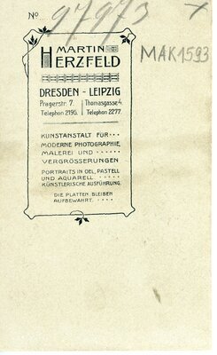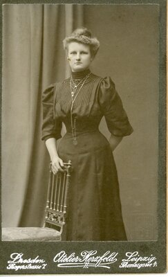 Die Dame steht, nach rechts gedreht, in einem Fotostudio hinter einem Stuhl mit gepolstertem Sitz und verzierter Rückenlehne. Ihre rechte Hand liegt auf der Rückenlehn, die linke hält sie hinter dem Rücken. Die Studiowand ist zur Hälfte von einem Vorhang verdeckt. Die Frau trägt ein langes dunkles Kleid, welches 3/4 lange Puffärmel, eine Wespentaille und einen Bahnenrock hat. Das Kleid hat einen Stehkragen und ist im Brustbereich in dünne Biesen gelegt. Am Stehkragen trägt sie eine kleine Brosche, um den Hals eine kurze Kette und eine lange mit einem Monokel. Desweiteren trägt sie Ohrringe und einen Ring an der rechten Hand. Ihre Haare hat sie locker nach oben zu einem Chignon frisiert. Die Aufnahme entstand im Atelier Martin Herzfeld in Leipzig. Auf der Rückseite befindet sich Eigenwerbung und der Hinweis zur Aufbewahrung der Platten.
