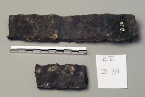 Gefunden im Jahr 1900 anlässlich der Öffnung der Kaiser- und Königsgräber im Dom zu Speyer. Zwei Fragmente flacher, breiter Eisenklammern, stark korrodiert, Knochenreste angebacken. An beiden Stücken sind noch Ansätze der Umknickung erhalten; sonst völlig unverziert. Auf einem beiliegendem Zettel handschriftlich: "von den Eisen-Klammern, mit welchen der Deckstein des Sarkophags Konrad II. befestigt war. 1. größeres Stück vom Kopfende (am wenigsten oxydiert), 2. kleineres Stück vom Fußende (stärker zerfressen)."