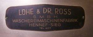 Große Gewerbewaschmaschine. Eine Trommelwaschmaschine und ein Toplader der Marke LÖHE & DR. ROSS G.M.B.H. WÄSCHEREIMASCHINENFABRIK HENNEF-SIEG TEL 407 Vorbesitzer war ein Hotel im Zentrum von Luxemburg. Firmengeschichte und Produktblatt siehe bei den Fotos Hersteller: Philipp Löhe gründete 1879 eine Maschinenfabrik mit Eisengießerei. Zuerst baute er Eisenbahnwaggons für die schmalspurige Bröltalbahn. Nach einem Brand produzierte das Unternehmen auch Fahrräder und Landmaschinen. 1931 begann die Fertigung von Waschmaschinen, Wäschezentrifugen und Bügelmaschinen. 1936 ging die "Ph. Löhe GmbH Maschinenfabrik und Eisengießerei" in die "Löhe & Dr. Ross GmbH" auf. Das Unternehmen bis in die 1960er Jahre. Die Betriebsgebäude wurden in den 1970er und 1980er-Jahren abgerissen. (Quelle: Historische Landmaschinen von A bis Z ..) Der Hersteller ist im Handelsregister von Siegburg nachweisbar. Amtsgericht Siegburg HRB 495 Neueintrag 1921 Löschung 1989 (Quelle: Handelsregistereintrag ..-) Die Direktorenvilla und die Gießereihalle sind noch erhalten. (Quelle: Fotos der Direktorenvilla ...)