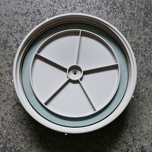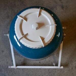Die Kugelwaschmaschine - auch Waschkugel genannt - besteht aus einer in einem Gestänge aufgehängten stufigen Kugel in die durch eine wasserdicht verschließbare Öffnung heißes Wasser, Lauge sowie die zu waschende Wäsche eingeführt wird. Die Wäsche wird durch das Drehen der Kurbel und die dadurch ausgelöste Bewegung der Kugel gereinigt. Diese Kugelwaschmaschinenen dürfen nicht mit der von Moore erfundenen und 1855 patentierten Kugelwaschmaschine verwechselt werden. Letztere besteht aus einem viereckigen Bottich in den zur Wäschereinigung Holzkugeln eingebracht werden. Obwohl schon seit den 1920er Jahren Kugelwaschmaschinen mit Elektroantrieb angeboten wurden (vergleiche hierzu die Kugelwaschmaschine SCANDOW von 1925 im Heimatmuseum der Stadt Teltow) wurden selbst in den 1950er Jahren die meisten Kugelwaschmaschinen für den Handbetrieb produziert. Die Kugelwaschmaschinen der 1950er Jahre sind eine Nischentechnologie, da zu dieser Zeit schon wesentlich größere Bottich- und Trommelwaschmaschinen sowie immer mehr auch Waschvollautomaten zur Verfügung standen. Dass Kugelwaschmaschinen zu dieser Zeit vor allem für den Handbetrieb gebaut wurden, kann auch damit zusammen hängen, dass sie für Einpersonenhaushalte und einkommensschwache Haushalte, die nicht mehrere Monatsgehälter für eine Waschmaschine ausgeben konnten, gebaut wurden. Später könnten sie auch fürs Camping und für Datschas genutzt worden sein. Das aktuelle Exemplar besteht aus einer innen weiß und und aussen blau emaillierten Metalltrommel mit einem schwarzen Rand an der Öffnung. Die Form des Wäschebehälters ist weniger eine Kugel als - wohl aus Kapazitätsgründen - ein an den Ecken abgerundeter Zylinder. Das Gestell aus lackiertem Vierkanteisen und der Dichtungsring sind weiß. Der Deckel und die Füßchen sind aus weißem Kunststoff. Die Kurbel fehlt. Es ist leider keine Herstellerangabe angebracht.