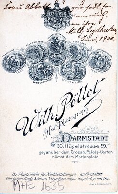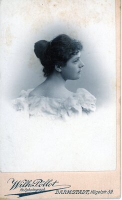 Man sieht eine hübsche junge Frau, die mit dem Rücken zur Kamera steht, den Kopf zur rechten Seite dreht und zufrieden schaut. Sie hat dicke dunkle Haare, in der Stirn gelockt und hinten zu einem großen Knoten gesteckt. Sie trägt eine weiße, weite und mit Volants besetzte Bluse, wobei Hals, Nacken u. Teile der Schulter nicht bedeckt sind. Auf der Rückseite ist das Emblem und verschiedene Auszeichnungen mit Wappen des Hoffotografen Wilh. Pöllert aus Darmstadt zu sehen. Außerdem sieht man eine handschriftliche, persönliche Widmung einer Milly L. aus dem Jahre 1900.