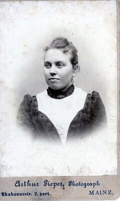 Das Bild zeigt eine Frau jungen Alters, die rechts an der Kamera vorbeischaut. Sie hat die die Haare, bis auf 2 Stirnlocken nach hinten gekämmt und vermutlich fest gesteckt. Man sieht ein 2 farbiges Oberteil. Die leichten Puffärmel sind dunkel, ebenso der kleine Stehkragen, der zudem mit einer kleinen länglichen Brosche geschmückt wird .Ausserdem ist der Stoff mit Stickereien verziert. Der V-förmige Ausschnitt zwischen Kragen und Unterbrustbereich ist in hellem bzw. weißem Stoff eingefasst. Unter dem Porträt steht der Name des Fotografen Arthur Pieper aus Mainz. Durch die Entwicklung entstand der Effekt einer Art Vignettierung. Auf der Rückseite sind verschiedene handschriftliche sowie gedruckte Zahlen, sowie Buchstaben und ganze Wörter zu sehen.