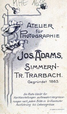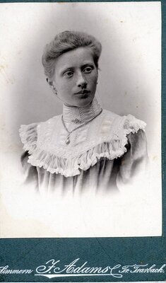 Das Foto zeigt eine Frau ,bzw. deren Oberkörper, der etwas schräg zur Kamera gezeigt wird. Sie blickt links an der Kamera vorbei. Man kann ihre Kleidung nur bis zu den Oberarmen sehen, da das Foto durch die Entwicklung den Effekt einer Art Vignettierung hat. So erkennt man eine vermutlich helle Bluse, die in Falten gelegt ist mit einem sehr großen weißen Schalkragen mit Spitzenabschluss und kleinem Stehkragen, den eine kleine zierliche Brosche ziert. Als weiteren Schmuck trägt sie eine mittellange Halskette mit tropfenförmigem Anhänger. Sie hat die Haare locker am Oberkopf zusammen gesteckt. Auf der Rückseite des Fotos sieht man das Emblem des Ateliers für Photographie Jos. Adams aus Simmern-Traben Trarbach mit dem Hinweis auf Nachbestellungen.