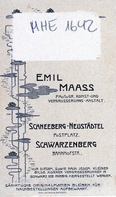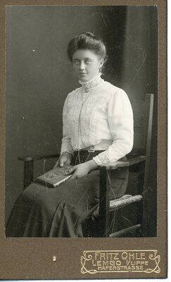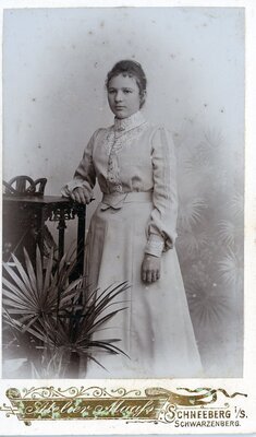 Das Foto zeigt eine junge Frau, die angelehnt an einem Hochstuhl oder einen Hochtisch lehnt. Sie trägt eine helle Bluse mit Stehkragen u breiten Manschetten. Außerdem einen hellen langen Rock welcher mit einem breiten Gürtel verziert ist. Die junge Frau hat dunkle, zu einem Dutt gebundene Haare und blickt seitlich an der Kamera vorbei.