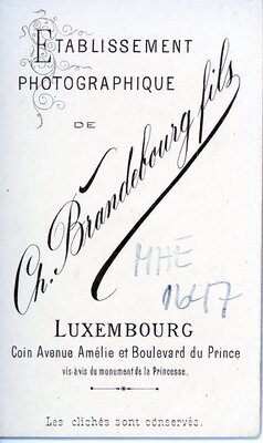 Fotografie, ovaler Ausschnitt, die eine junge Frau zeigt, die etwas seitlich zur Kamera steht oder sitzt. Dabei schaut sie rechts an der Kamera vorbei. Ihre Haare sind auf dem Oberkopf zu einem Dutt gekämmt. Sie trägt ein dunkles Oberteil welches mit hellem Revers u. dunkler, großer Schleide verziert ist. Auf der Rückseite des Fotos ist das Emblem des Fotoateliers Brandebourg Fils aus Luxembourg