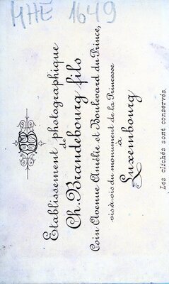 Das Foto zeigt eine junge Frau, die etwas seitlich, vermutlich an einen mit Samtkissen belegtem Gebetsstuhl o.ä. , steht. Sie hat die rechte Hand auf diesem Kissen aufgelegt u. schaut rechts an der Kamera vorbei. Sie trägt ein dunkles, mit langer Knopfleiste und großer hellererer Schleife, verziertes Kleid. Ihre blonden mittellangen Haare sind offen , wobei die Seitenpartien am Hinterkopf zusammengesteckt sind. Sie trägt kleine Ohrhänger. Die Aufnahme ist vermutlich in einem Studio mit Atelierbemalung entstanden. Auf der Rückseite ist das Emblem eines Fotoateliers Brandebourg fils aus Luxembourg.