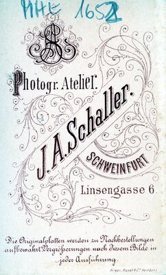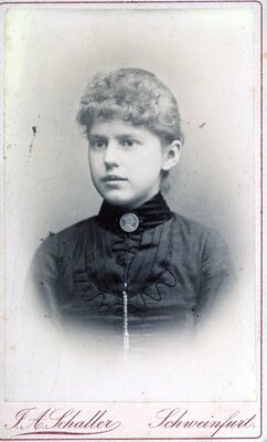 Die Vignettenaufnahme zeigt ein junges Mädchen welches rechts an der Kamera vorbeischaut. Sie trägt ein dunkles Oberteil mit schwarzem Stehkragen, der mit einer hellen Brosche verziert ist. Außerdem erkennt man schwarze Stickerei und eine Art Anhänger oder Kette, der am Oberteil befestigt ist. Man erkennt an ihrem hohen Pony, dass ihre hellen Haare vermutlich gelockt sind. Auf der Aufnahme-Rückseite ist das Emblem des Ateliers Schaller aus Schweinfurt mit dem Hinweis für Nachbestellung etc, zu sehen.