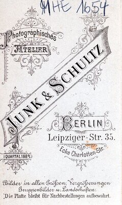 Das Foto ist mit einem ovalem Passpartout dargestellt. Es zeigt eine Frau mittleren Alters die an einem verzierten Stuhl steht und rechts an der Kamera vorbeischaut. Sie trägt ein weißes Kleid , dessen Oberteil eng anliegend, jedoch mit weitem Revers, sogenannte Blusentaille und Verzierungen auf den Schultern, Ärmeln und im Brustbereich. Der Rock fällt weit und glockig. Ihre Haare sind zu einem hohen Knoten auf dem Oberkopf gebunden. In der linken Hand hält sie einen runden Fächer. Außerdem trägt sie ein enges, dunkles vermutliches Samtband mit Amulett. Auf der Rückseite des Fotos ist das Emblem des Ateliers Junk & Schultz mit Hinweis auf Nachbestellungen abgebildet.
