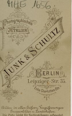Die Aufnahme im runden Passpartout-Rahmen zeigt ein Mädchen, dass den Kopf nach links gedreht hat. Man erkennt ein helles, in Längsfalten gelegtes Oberteil, welches ein kleines Blütenbouquet ziert. Die Schultern betonen große Schleifen. Sie trägt ein dunkles Kropfband mit Anhänger, kleine Ohrstecker und ihre Haare sind auf dem Oberkopf hochgesteckt und mit dem sogenannten Kopfputz (Federn, Spangen etc.) gehalten. Auf der Rückseite sieht man das Emblem des Ateliers Junk & Schultz mit Hinweis zu Nachbestellungen etc.