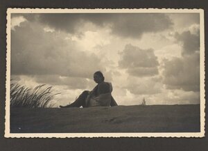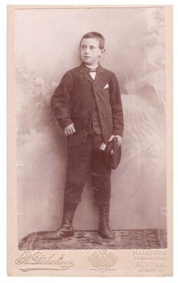 Zu sehen ist ein kleiner Junge von ca. sechs Jahren im Fotoatelier. Er steht seitlich zum Fotografen und hat die Hände auf ein Bich gelehnt, welches auf einem Stuhl liegt. Er trägt einen schwarzen Anzug mit einer dreiviertel langen Hose. Der Junge blickt den Fotografen direkt an und zeigt, mit der rechten Hand, auf eine Seite im Buch. Das Foto ist auf ein Stück Pappe geklebt, auf dem unten der Name und der Sitz des Ateliers vermerkt sind.