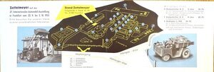 Vierseitiges Faltblatt im Querformat, dass zusammengefaltet der Größe einer Postkarte entspricht. Die Broschüre wurde von dem in Trier ansässigen Industriegrafiker Erich Prinz anlässlich der im Jahre 1955 durchgeführten 37. Internationalen Automobil-Ausstellung in Frankfurt erstellt. Auf der ersten Seite befindet sich u.a. die Skizze eines Autoschütters und der Firmenname. Die beiden Innenseiten enthalten neben zwei gezeichneten Baumaschinen Angaben zur Dauer der Veranstaltung und zur Lage des Messestandes der Firma Zettelmeyer. Auf der Rückseite befinden sich Informationen zu den verschiedenen Ausstellungshallen und dem Freigelände.