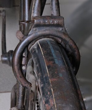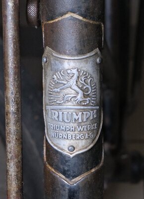 Das Damenrad hat eine Größe von 28 Zoll. Am Sattelrohr ist die Rahmennummer 901 096 per Hand eingeschlagen. Damit lässt sich das Herstellungsdatum auf die Jahre 1945/46 eingrenzen. Der Rahmen und die Schutzbleche haben eine schwarze Lackierung, die durch feine weiße und blaue Streifen aufgelockert ist. Zwei Abziehbilder am Rahmen sind nur noch schemenhaft zu erkennen. Das Triumph Steuerkopfschild ist aus Metall gefertigt und zeigt das Firmenlogo. Am Steuerkopf ist noch eine Lenkerfeststellschraube verbaut, was zu der Vermutung führt, dass der Rahmen noch aus einer Vorkriegsproduktion stammt. Die Freilaufnabe "Torpedo" stammt von Fichtel und Sachs. Zwei Bremsmöglichkeiten sorgen für Sicherheit. Rücktritt- und eine Handbremse (Stempelbremse). Gegen Diebstahl ist das Rad durch ein Ring bzw. Speichenschloss gesichert. Es funktioniert heute noch einwandfrei (Siehe Abb)