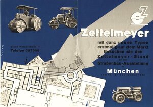Gefaltete Broschüre der Firma Zettelmeyer anlässlich der Straßenbau-Ausstellung im Jahre 1936 in München. Die Broschüre wurde von dem in Trier ansässigen Industriegrafiker Erich Prinz erstellt. Im gefalteten Zustand handelt es sich um eine Broschüre in der Größe DIN A 5. Auf der ersten Seite befindet sich neben dem Firmenname und dem Logo die Silhouette einer Stadt. Auf den beiden Innenseiten sind die grafische Beschreibung der Lage des Messestandes der Firma Zettelmeyer, 2 Zeichnungen einer Straßenwalze und eine Zeichnung eines Dieselschleppers abgebildet. Im oberen Bereich der Rückseite ist ein Zitat Adolf Hitlers vom 01.05.1933 sowie die Beschreibung der Umsetzung der im Bezug auf Straßenbaumaschinen politisch vorgegebenen Ziele angebracht. Darunter gibt es eine kurze Beschreibungen der von der Firma Zettelmeyer angebotenen Straßenwalzen und des Dieselschleppers.
