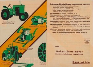 4seitiges Prospekt der Firma Zettelmeyer. Gefaltet hat es eine DIN A5-Größe. Beworben wird der Dieselschlepper Typ Z I. Auf der ersten Seite ist im Vordergrund die landwirtschaftliche Maschine als zweidimensionale Zeichnung abgebildet. Auf den beiden Innenseiten befinden sich eine weitere Zeichnung des Schleppers, Zeichnungen verschiedener Zubehörteile, wie eine Seilwinde und ein Mähwerk. Außerdem enthält die Broschüre auf den Seiten 3 und 4 technische Angaben und Informationen zum Betrieb des Gerätes. Daneben beinhaltet sie eine vorbereitete Postkarte zur Anforderung eines unverbindlichen Preis-Angebotes. Die Broschüre wurde von dem in Trier ansässigen Industriegrafiker Erich Prinz erstellt.
