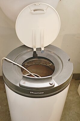 Kleine Toplader-Wäscheschleuder. Die Schleuder besitzt innen eine verzinkte Trommel, aussen eine Kuststoffummantelung und einen ebenfalls aus Kunststoff bestehenden Deckel. Hersteller war die Firma Robert Thomas Elektrowerke, Neunkirchen/Siegerland. Die Firma wurde um 1900 gegründet und prodzierte zuerst eine Milchkanne aus Stahlblech. Seit den 1950er-Jahren wurden Trommel-Waschmaschinen und Wäscheschleudern, die unter eigenem Namen und als OEM vertrieben wurden. Heute (2022) produziert das Unternehmen neben Wäschschleudern vor allem Staubsauger, vor allem Naß-Staubsauger.