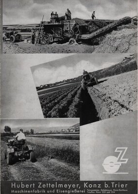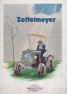 Mehrseitiges Werbeprospekt für den Diesel-Schlepper Typ Z I. Das Prospekt wurde für Vertriebspartner der Firma Zettelmeyer von dem in Trier ansässigen Industriegrafiker Erich Prinz erstellt. Auf der DIN A4 großen Vorderseite ist die mehrfarbige perspektivische Zeichnung eines fahrenden Diesel-Schleppers abgebildet. Im unteren Bereich befindet sich der Stempelabdruck mit den Firmenangaben des Vertreibspartners. Die Innenseite hat im aufgeklappten Zustand eine Größe von 2 1/2 DIN A 4 Seiten. Darin enthalten sind neben der farbigen Zeichnung des Fahrzeuges und perspektivischen Schnittzeichnungen von Motor, Getriebe und Antriebsachse, alle wesentlichen technischen Angaben. Auf der Rückseite der 1/2 DIN A4-großen Innenseite befinden sich zwei angebotene Anbaugeräte. Die Rückseite des zusammengefalteten Prospektes ist mit 3 Schwarz-Weiß-Fotografien gestaltet. Darauf ist jeweils ein Diesel-Schlepper im landwirtschaftlichen Einsatz zu sehen.