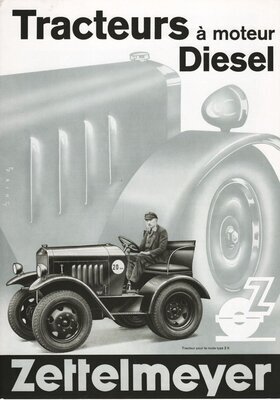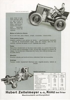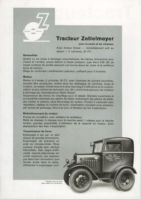 4seitiges Faltblatt der Firma Zettelmeyer. Gefaltet besitzt es eine DIN A4-Größe. Beworben werden die Dieselschlepper Typ Z I und Z II. Auf der ersten Seite ist neben dem Firmenname und einem Hinweis auf einen Diesel-Schlepper im Hintergrund die Frontpartie dieses Fahrzeugs und davor als perspektivische Zeichnung ein Diesel-Schleppers Typ Z II abgebildet. Auf den beiden Innenseiten befinden sich jeweils eine Zeichnung eines Fahrzeugs mit und ohne Fahrerkabine sowie die Zeichnung eines Motors und der Antriebsachse. Daneben sind Beschreibungen der Konstruktion und die technischen Daten beider Fahrzeuge abgedruckt. Die Rückseite enthält Zeichnungen und Beschreibungen zu Anbauteilen und angebotenem Zubehör. Die Broschüre, von der sich auch ein holländisches Exemplar im Besitz des Freilichtmuseums befindet, wurde von dem in Trier ansässigen Industriegrafiker Erich Prinz erstellt.