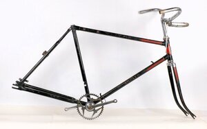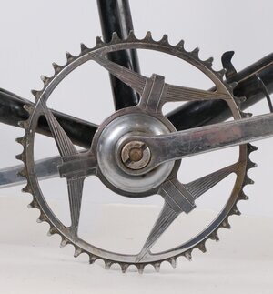 Der Fahrradrahmen, mit Vordergabel und Lenker, wurde von der Firma Adler, die auch für Büromaschinen, Motorräder und der Produktion von Autos bekannt ist, hergestellt. Die Rahmennummer 549 026 konnten wir dem Produktionsjahr 1920 zuordnen. Die schwarz/rote Lackierung ist noch gut erhalten. Auf dem Unterrohr sind beidseitig Abziehbilder mit dem Schriftzug ADLER angebracht. Im Kettenblatt ist der stilisierte Adler mit ausgebreiteten Schwingen eingearbeitet.