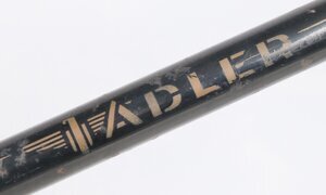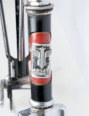 Der Fahrradrahmen, mit Vordergabel und Lenker, wurde von der Firma Adler, die auch für Büromaschinen, Motorräder und der Produktion von Autos bekannt ist, hergestellt. Die Rahmennummer 549 026 konnten wir dem Produktionsjahr 1920 zuordnen. Die schwarz/rote Lackierung ist noch gut erhalten. Auf dem Unterrohr sind beidseitig Abziehbilder mit dem Schriftzug ADLER angebracht. Im Kettenblatt ist der stilisierte Adler mit ausgebreiteten Schwingen eingearbeitet.
