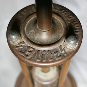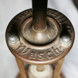 Die Grundidee des Wäschestampfers ist die folgende: Um seine volle Wirkung zu entfalten benötigt das Waschpulver (bis in die 1960er-Jahre meistens Soda) Sauerstoff. Dies geschah ursprünglich indem die Wäscherinnen die in einem Zuber in lauwarmer Soda-Lauge befindliche Wäsche mit den nackten Füßen getreten oder die Wäsche mit einem Waschbrett gereinigt habe. Ein Wäschestampfer, der es ermöglicht die Lauge mit Sauerstoff zu durchmischen und gleichzeitig die Wäsche zu bewegen, brachte hier eine wesentliche Erleichterung für die Wäscherinnen und war der erste Schritt zur mechanischen Reinigung der Wäsche. Im Wäschebottich beziehungsweise im Waschzuber wird verschmutzte Wäsche durch Sauerstoffzufuhr und die Bewegung mit dem Wäschestampfer gereinigt. Der Stampfer presst nicht nur die Lauge mit dem Schmutz aus dem Gewebe, sondern saugte auch die Lauge an und sprudelte diese über das Waschgut, wodurch das Gewebe durchspült wird und der gelockerte Schmutz sich am Boden sammelt. Dieser Wäschestampfer hat eine ungewöhnliche Form und Funktionsweise. Er ist technisch gesehen eine Pumpe mit der Luft angesaugt und in die Lauge gepresst werden kann. Die Pumpe ist eine Saugpumpe mit einem Kolben der in einem Rohr verläuft. Am oberen Ende der Stange der Stange befindet sich ein gedrechselter Griff. Der unterste Teil des Rohrs hat einen etwas geringeren Durchmesser und kann in das darüberliegende Rohr hineingeschoben werden. An Stange befestigt sind2 glpckenförmige durchlöcherte Metallteile, das obere in Form einer hängenden das untere in Form einer stehende Glocke die mit ihrer breten Seite zusammenstoßen sowie darunter ein unten gekrümmter Teller angebracht sind. Ganz oben am oberen Rohr, zwischen dem untersten und dem mittleren Teller und ganz unten um unteren Rohr sind seitlich kleine Löcher angebracht durch die Luft einströmen und austreten konnte. Das unterste Rohr ist unten mit einem Pfropfen verschlossen, der möglicherweise auch zum "rubbeln" der Wäsche verwendet werden konnte. Bei "unserem" Exemplar kann die Stange nicht mehr bewegt werden. Marke / Hersteller (?) eventuell Wasch Blitz Die hier mit hochgeladene Beschreibung auf des Geräts bei der Anmeldung als Gebrauchsmuster beim Deutschen Patentamt von 1951 könnte sich auch auf ein im Detail anderes Gerät (dies wäre nur duch ein Auseinanderbauen dieses Geräts zu klären) erklärt aber die prinzipielle Funktionalität.