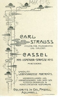 Auf dem Foto erkennt man eine ältere Frau auf einem Sitzmöbel mit dicker Samtpolsterung und aufwendigen Drechselelementen. Ihr linker Arm, an dessen Hand sie einen Ring trägt, liegt auf der Armlehne auf. In ihrer rechten Hand hält sie ein Buch. Sie trägt ein langes dunkles Kleid mit langen Armen und einem Stehkragen. Die Haare sind in der Mitte gescheitelt und streng nach hinten zu einem kleinen Knoten frisiert. Die Aufnahme entstand im Atelier für Photographie und Malerei Carl Strauss in Cassel (heute Kassel). Auf der Rückseite befindet sich Eigenwerbung des Ateliers mit dem Hinweis auf Vergrößerungen und Nachbestellungen.