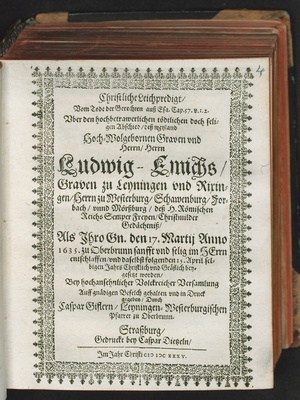 Christliche Leichpredigt/ Weyland dem Hoch- vnd Wolgebornen Graven vnd Herrn/ Herrn Ludwig Emich/ Graven zu Leiningen vnnd Rixingen/ Herrn zu Westerburg ... : Zu vnderthänigen letzten Ehren gehalten zu Mietisheim/ am Sontag Misericordia Domini / Von M. Burckhardt Kellern/ Leiningen-Westerburgischen Pfarrern daselbst