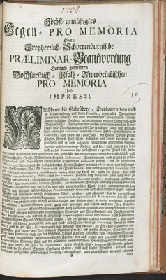 Höchst-gemüßigtes Gegen- Pro Memoria Oder: Freyherrlich-Schorrenburgische Praeliminar-Beantwortung Hernach gemeldten Hochfürstlich- Pfaltz-Zweybrückischen Pro Memoria Und Impressi